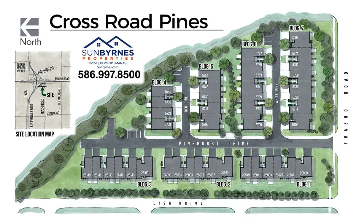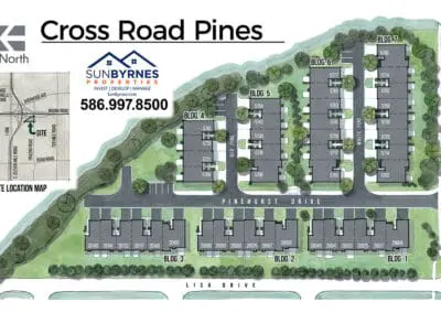 SunByrnes Properties & Construction developed and built an apartment complex at 5750 White Pine Rd. in Warren, MI. The building includes 24 units with 20 of them having 2 bedroom and 1.5 bathrooms (1,310 sq. ft. each) and the other four have 3 bedrooms and 2 bathrooms in each (1,861 sq. ft. each). The building in total is 33,644 sq. ft. and it was completed in July of 2022.