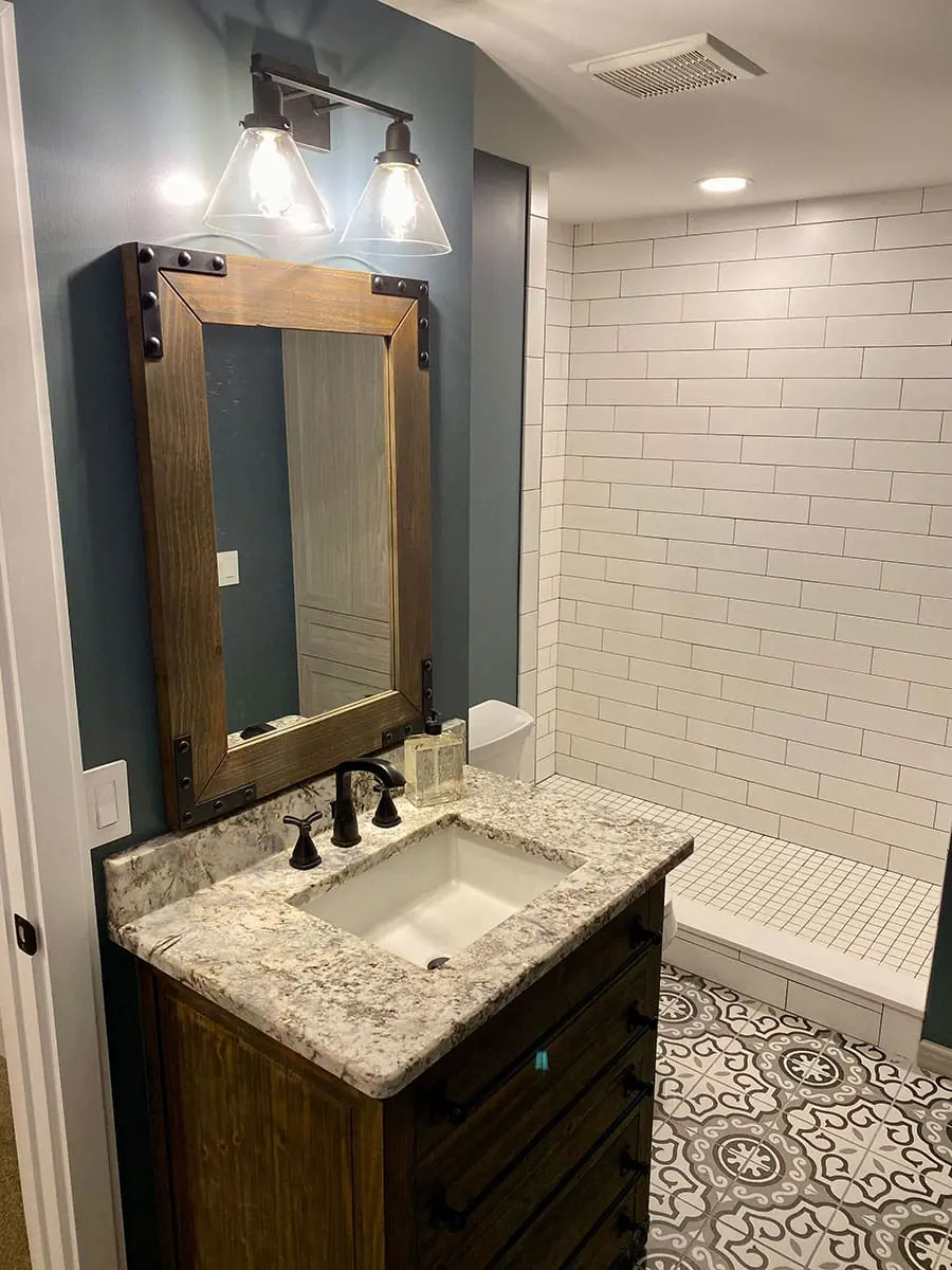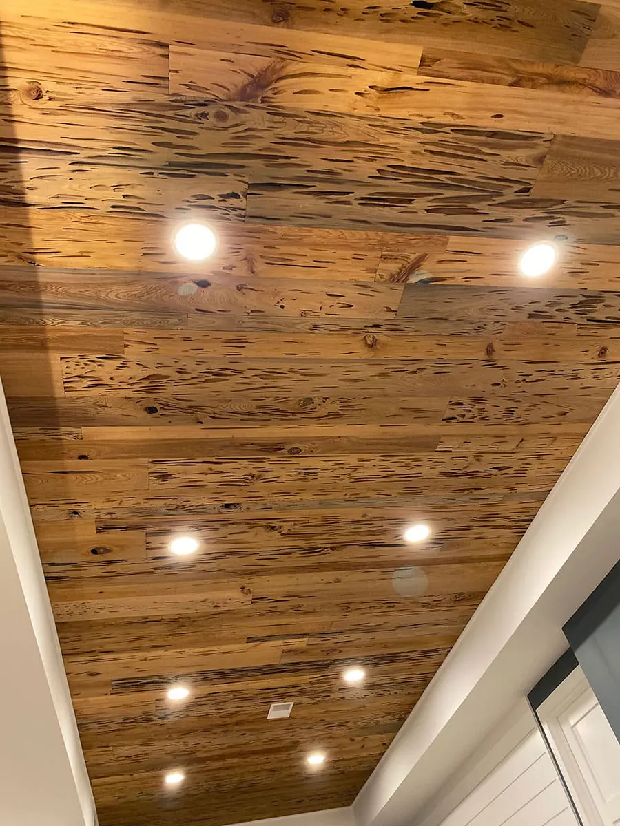 At Sunbyrnes Properties and Construction, we pride ourselves on creating stunning, one-of-a-kind spaces for our clients. One of our recent projects exemplifies our commitment to exceptional craftsmanship and innovative design—a beautifully finished basement featuring pecky cypress wood on the ceiling.