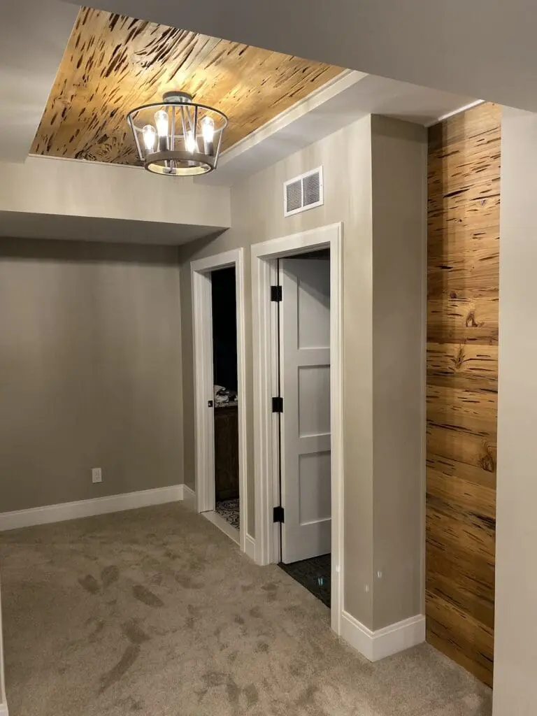 At Sunbyrnes Properties and Construction, we pride ourselves on creating stunning, one-of-a-kind spaces for our clients. One of our recent projects exemplifies our commitment to exceptional craftsmanship and innovative design—a beautifully finished basement featuring pecky cypress wood on the ceiling.